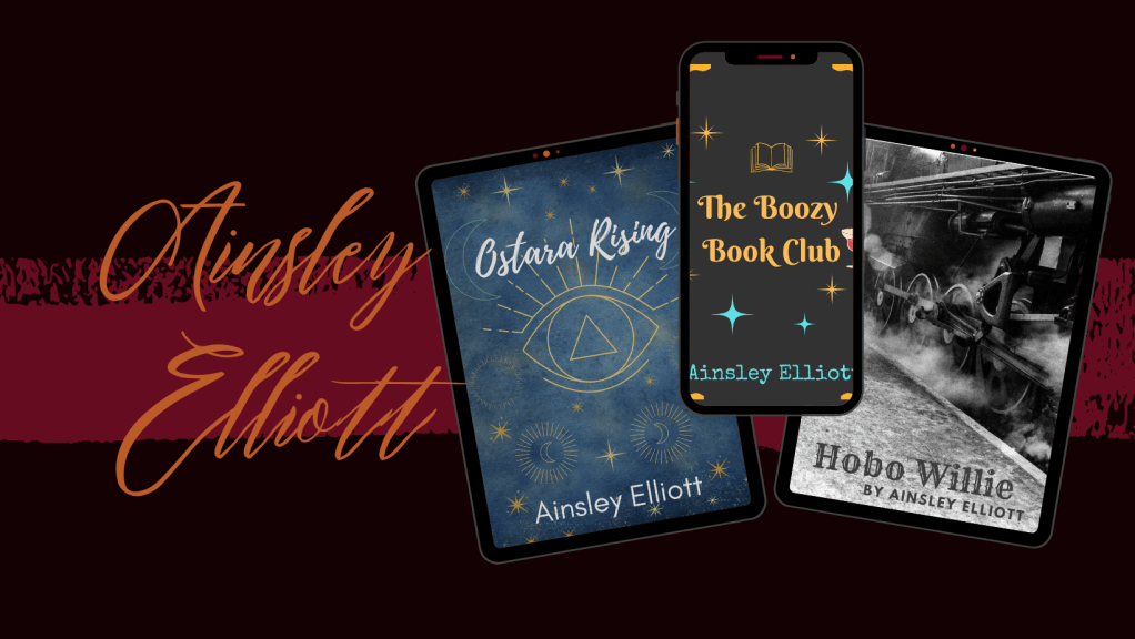 Ainsley Elliott has a dual MA in English & Creative Writing. The author of Hobo Willie, Ostara Rising, and The Boozy Book Club. She writes multi-genre short stories with Coffee House Writers and her current WIP, and debut novel, is a Paranormal Romantic Thriller.